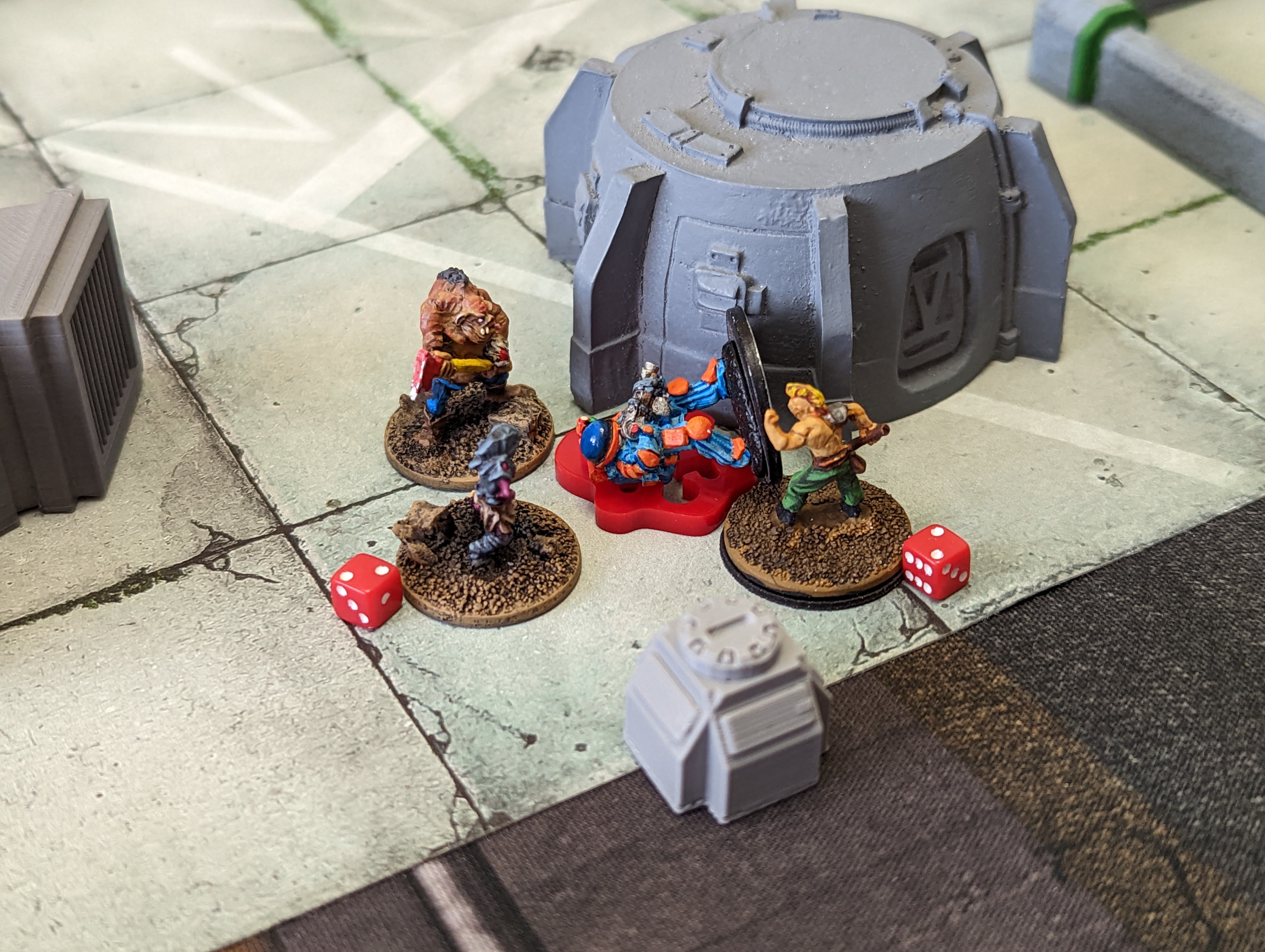 Vorann jump boots his way over all of the obstacles and gets into hiding near the virus bomb. The bomb is a priority because when it goes off it kills EVERYBODY, and the recovery rolls gets modified to all but guarantee that everybody stays dead. Better to lose a few to the fight than lose everything to the bomb.